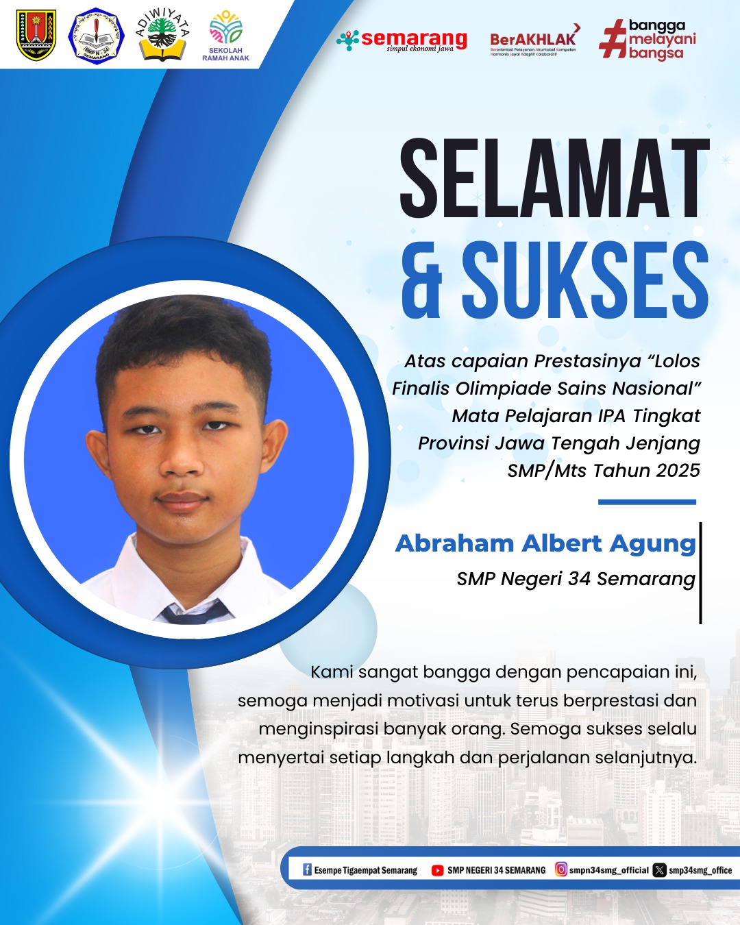 Semarang, Juli 2025 — Prestasi membanggakan kembali ditorehkan oleh siswa SMP Negeri 34 Semarang. Abraham Albert Agung, siswa kelas 8A yang kini telah naik ke kelas 9A, berhasil lolos sebagai Finalis Olimpiade Sains Nasional (OSN) IPA tingkat Provinsi Jawa Tengah tahun 2025. Pencapaian ini diawali dari keberhasilan Abraham menembus seleksi ketat OSN tingkat kota dan mengalahkan puluhan peserta dari berbagai SMP di Kota Semarang.